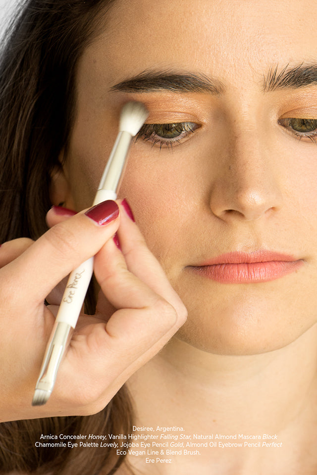 The line of the Ere Perez Eco Vegan Line & Blend Brush can be used to apply a classic thin line along the lash line or to fill in eyebrows. The other side features a fluffy round shade to blend with a transition shade for a sheer wash of colour in the crease, or go over the edges of your shadow so there are no harsh lines. Made with high quality biodegradable materials – vegan bristles and a corn resin handle.