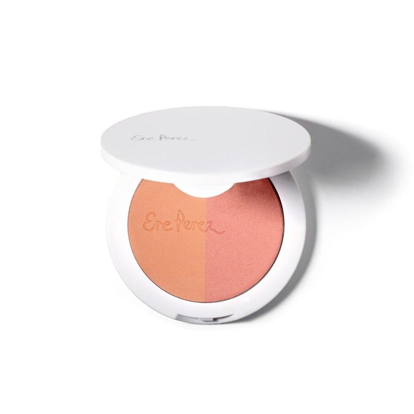 Pure colour DUO. Luxurious multitasking rice powder blush from Ere Perez with 2 blendable shades. Matte mandarin & pink glimmer for a sun-kissed look. Suits all skin types & tones. Made with non-GMO rice to help absorb oil and create a velvet finish. Allows skin to breathe and conditions with vitamin E and chamomile. This is a day or night blush, take your rosy cheeks everywhere! Youthful and fresh. Stylish compact with magnetic colour insert. Easy to remove when it’s empty & ready for a refill Best applied with the Ere Perez eco vegan all-beauty brush.