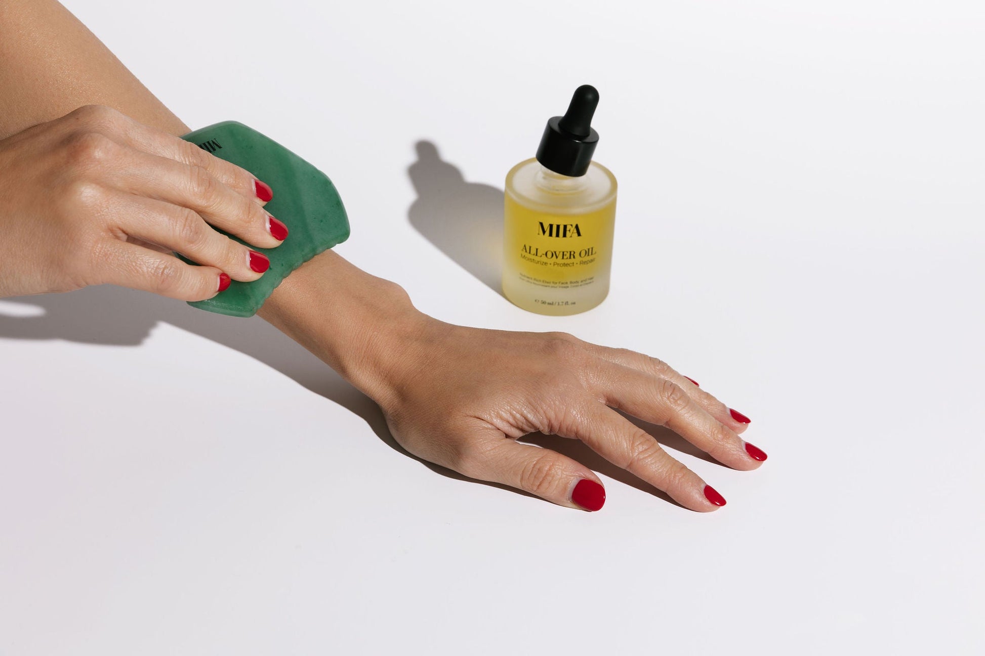 Gua sha is a centuries-old beauty ritual rooted in traditional Chinese medicine that promotes better circulation, lymphatic flow, and improved overall skin health. MIFA's Aventurine Gua Sha is hand carved with specific angles and the perfect thickness to perfectly adapt to your face and body and provide an easy yet effective gua sha massage.