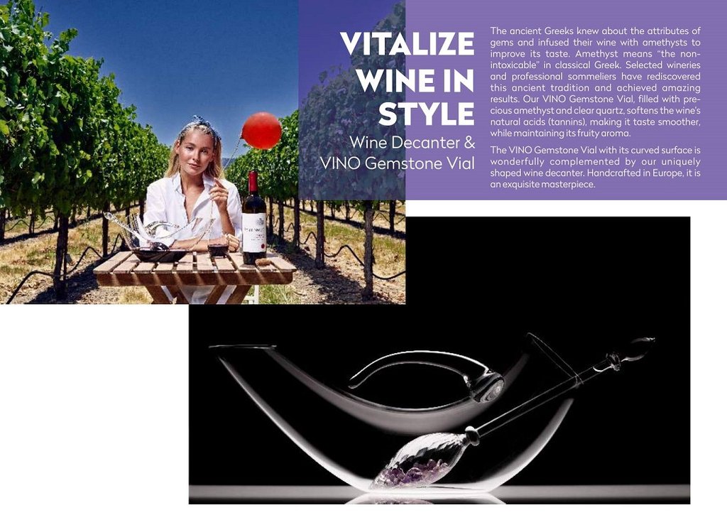 The VitaJuwel VINO Gemstone Vial, filled with precious amethyst and clear quartz, softens the wine's natural acids (tannins), making it taste smoother, while maintaining its fruity aroma.